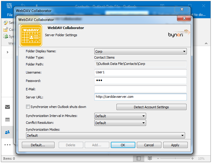 Microsoft Outlook does not provide the built-in CardDAV support. To sync your CardDAV contacts, you will need the third-party connector. Below we will describe how to use Bynari Collaborator to sync CardDAV address book contacts.