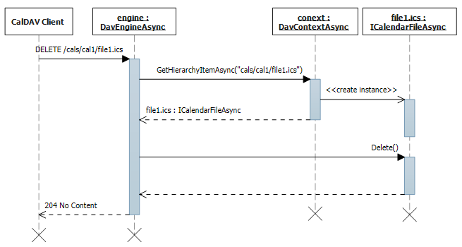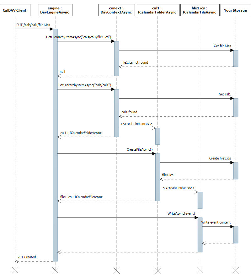 - The Engine calls DavContextBaseAsync.GetHierarchyItemAsync passing the path of the folder in which the file should be created (cals/cal1). You will return a calendar, implementing ICalendarFolderAsync to the Engine.