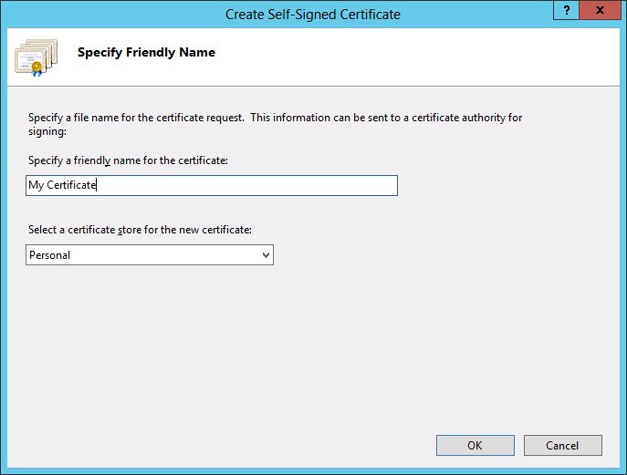 Enter the certificate name in the Create Self-signed Certificate dialog and click OK: